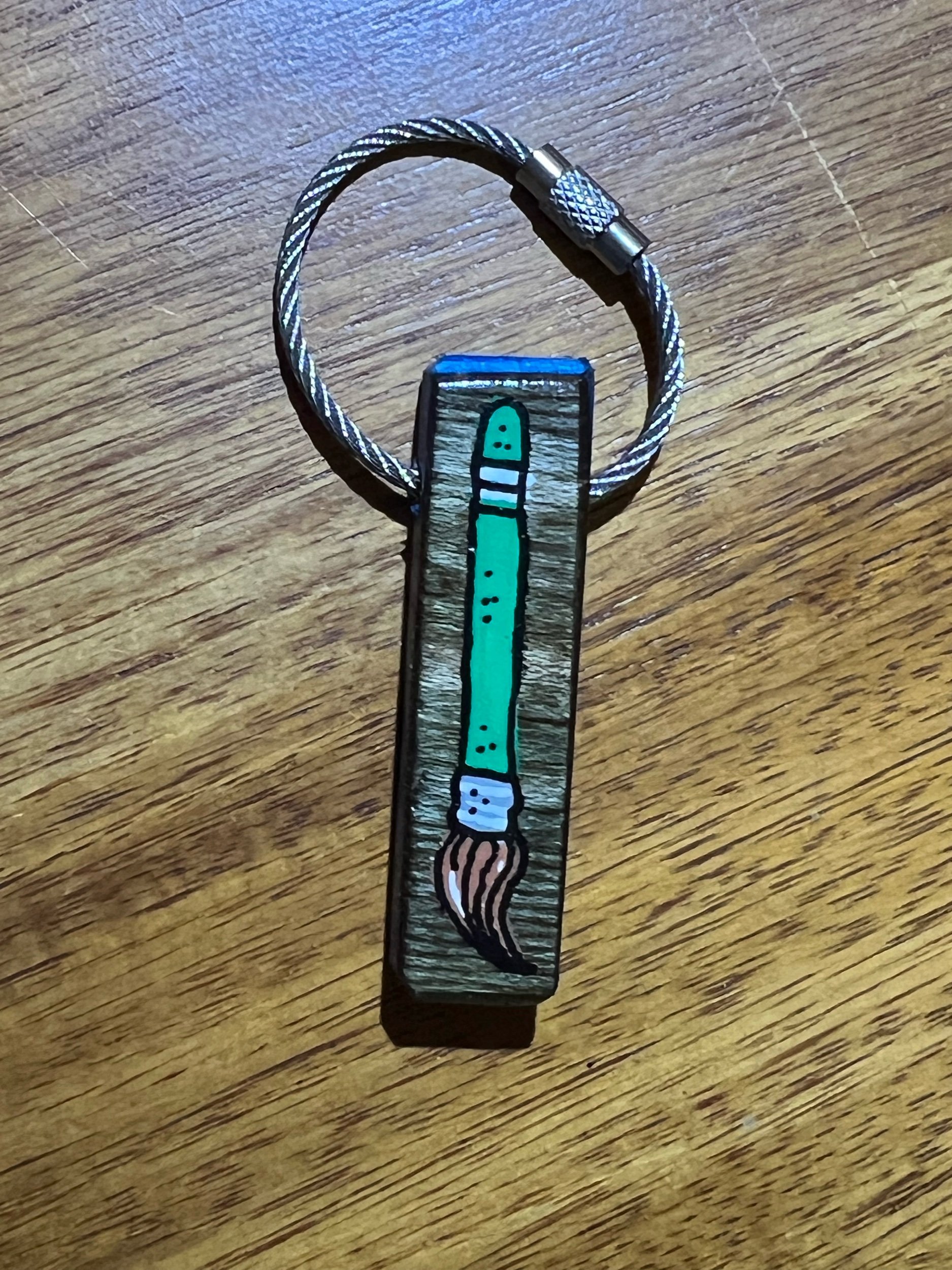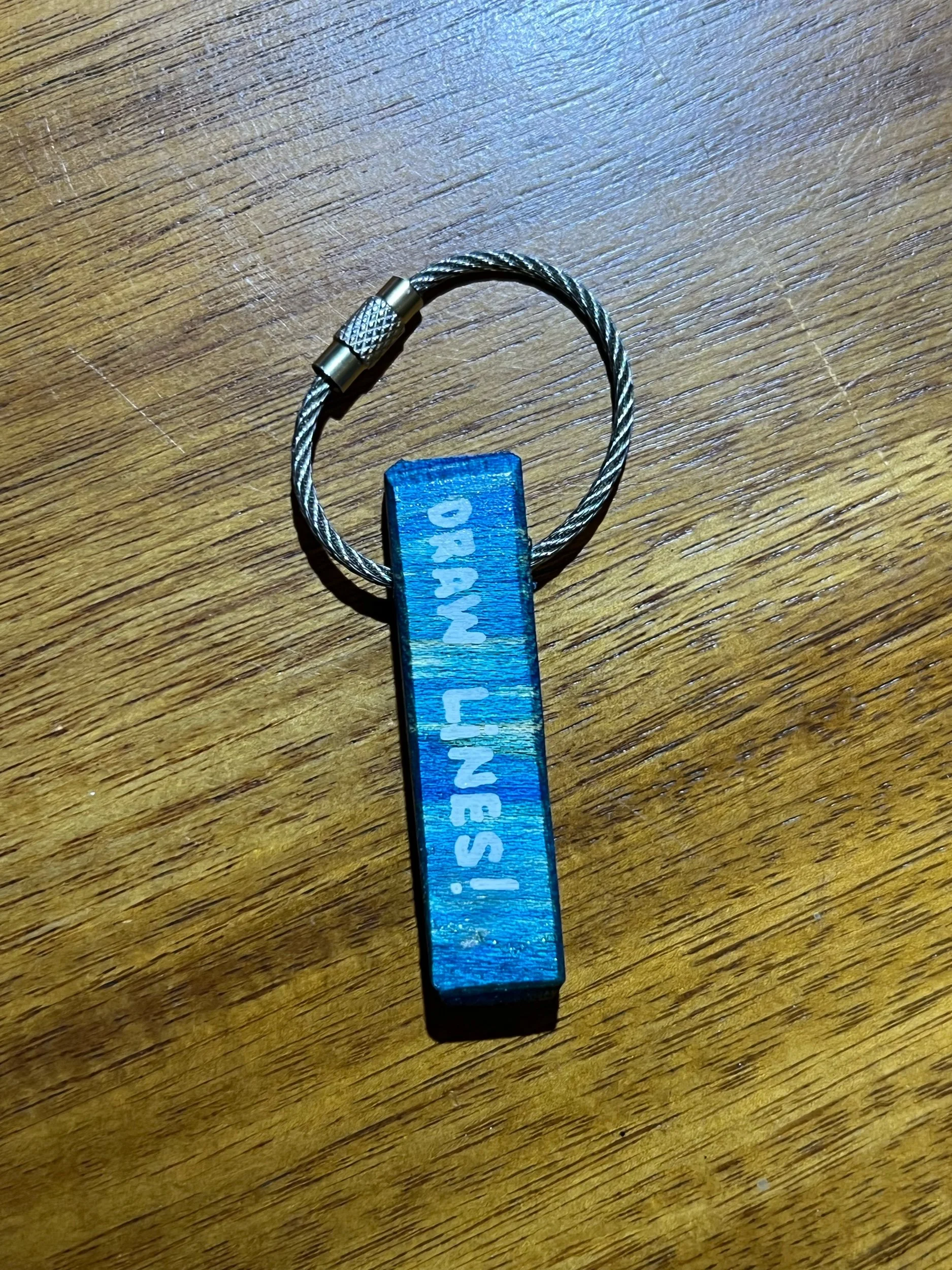 cut, sanded, painted, coated with poly urethane, and attached with a steel cable link.