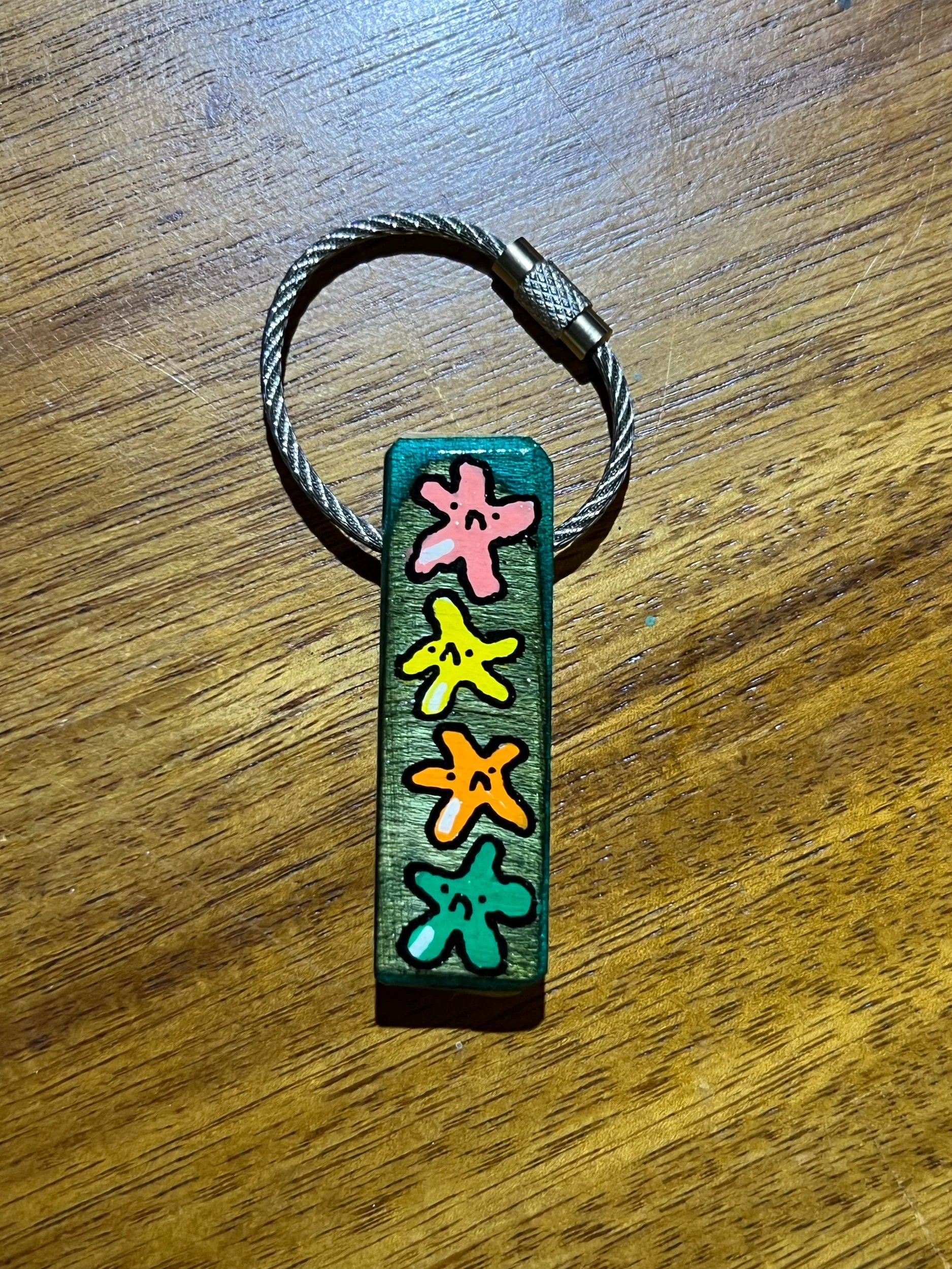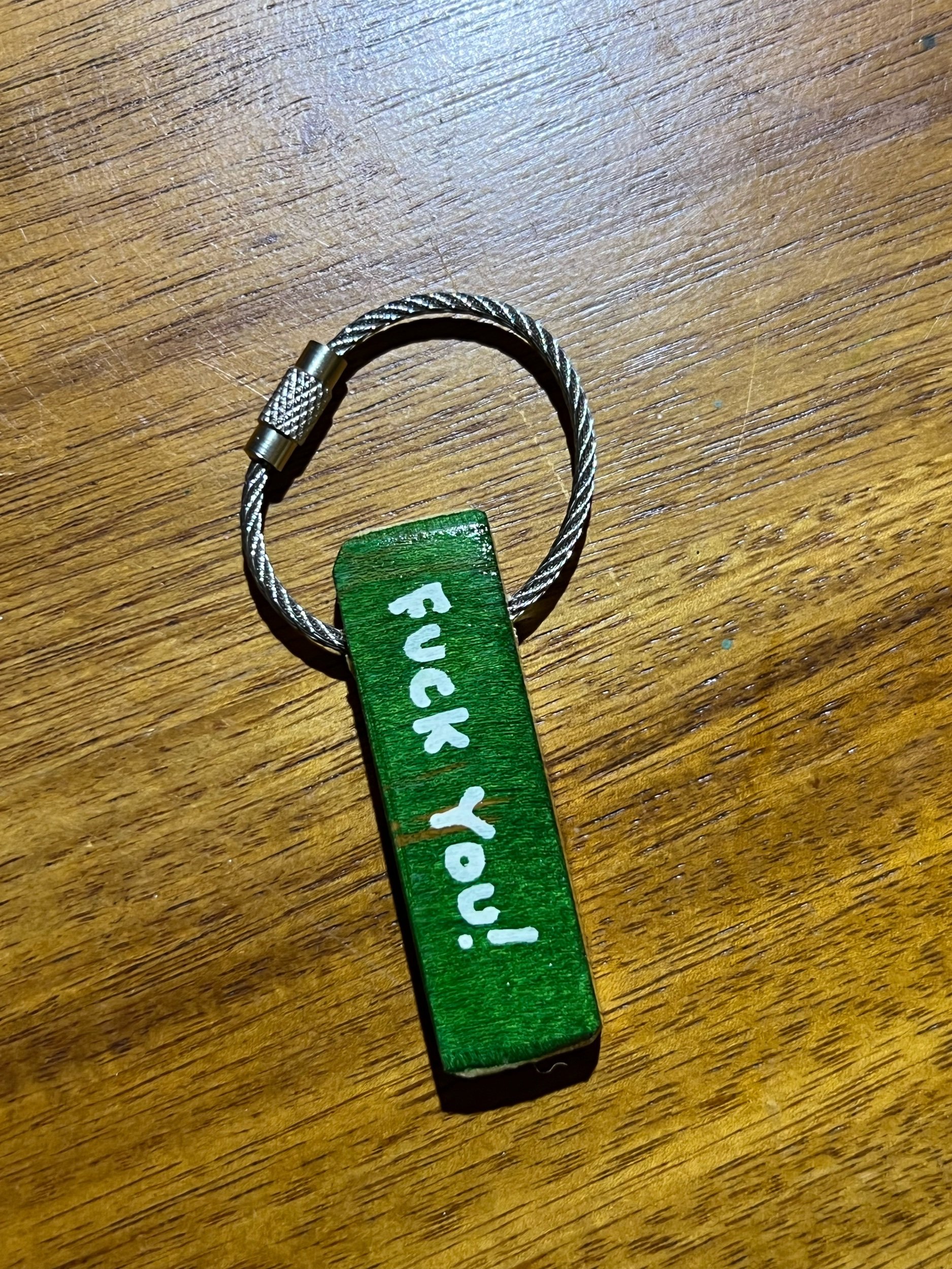 cut, sanded, painted, coated with poly urethane, and attached with a steel cable link.