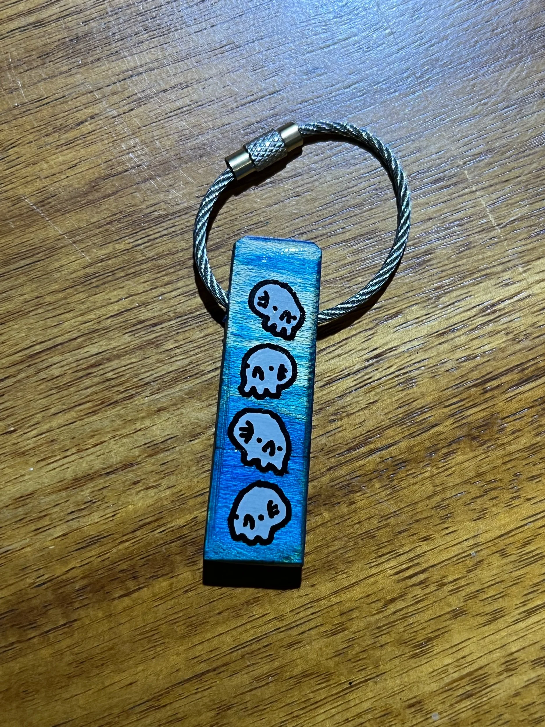 cut, sanded, painted, coated with poly urethane, and attached with a steel cable link.