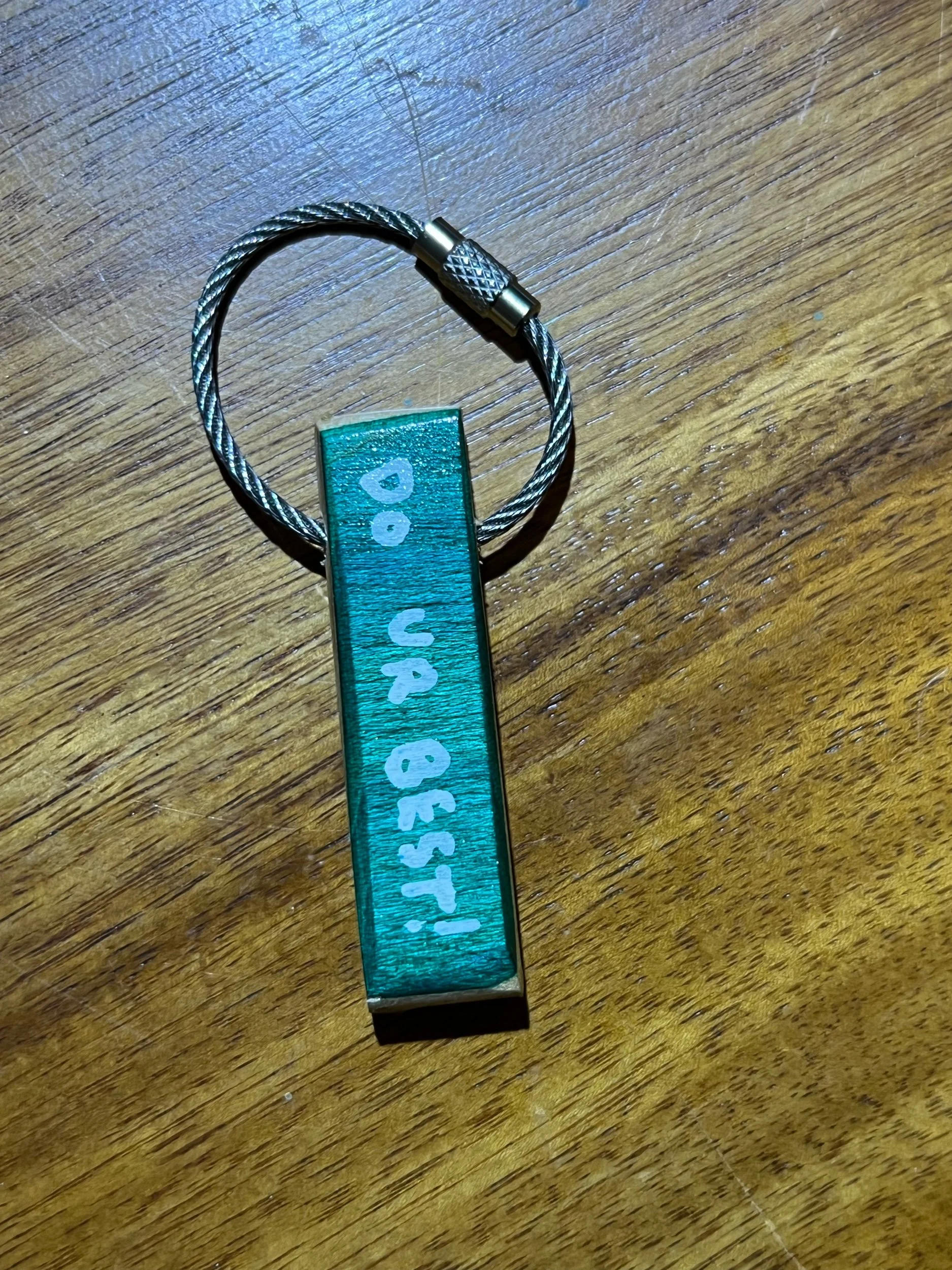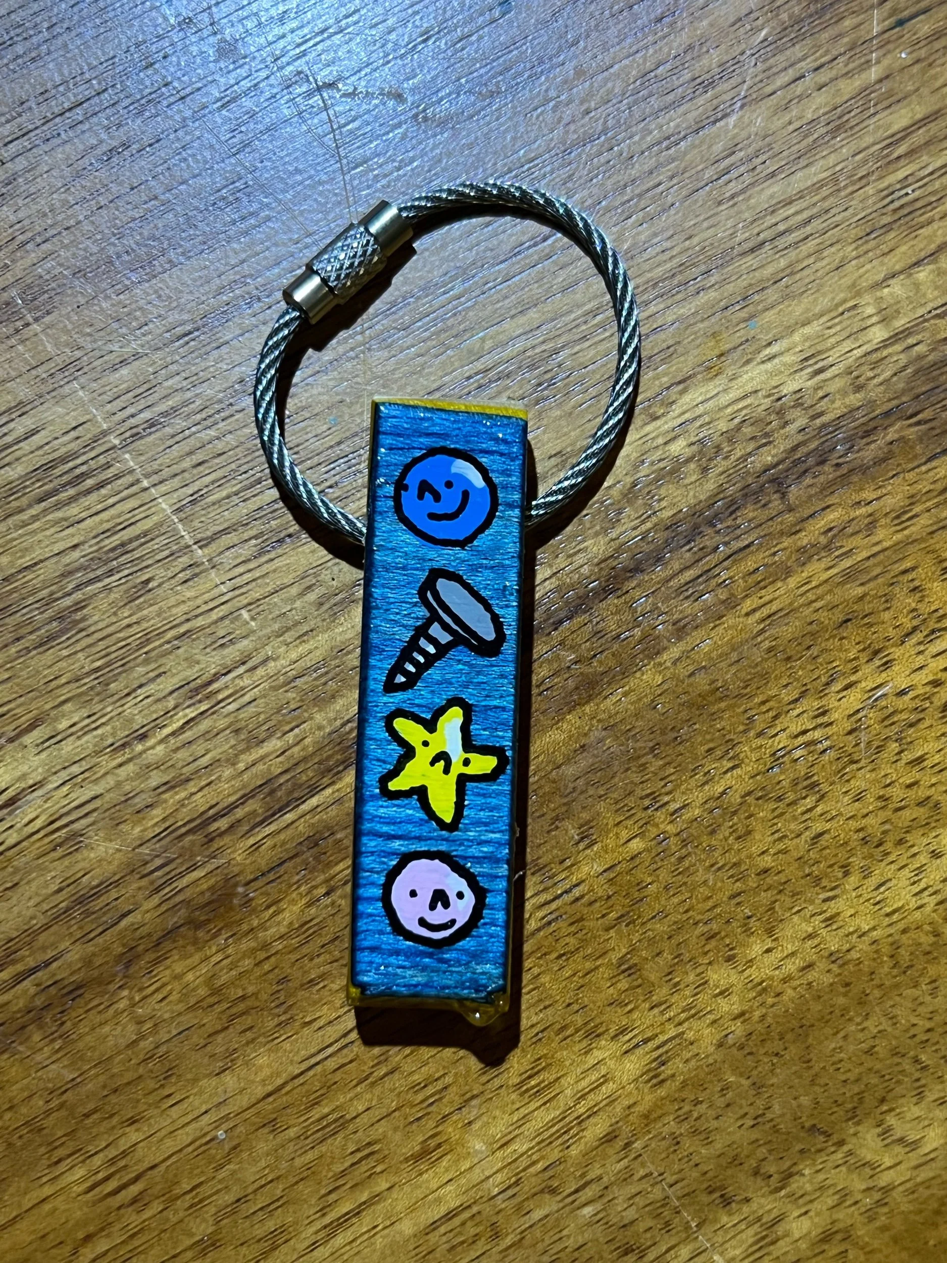 cut, sanded, painted, coated with poly urethane, and attached with a steel cable link.
