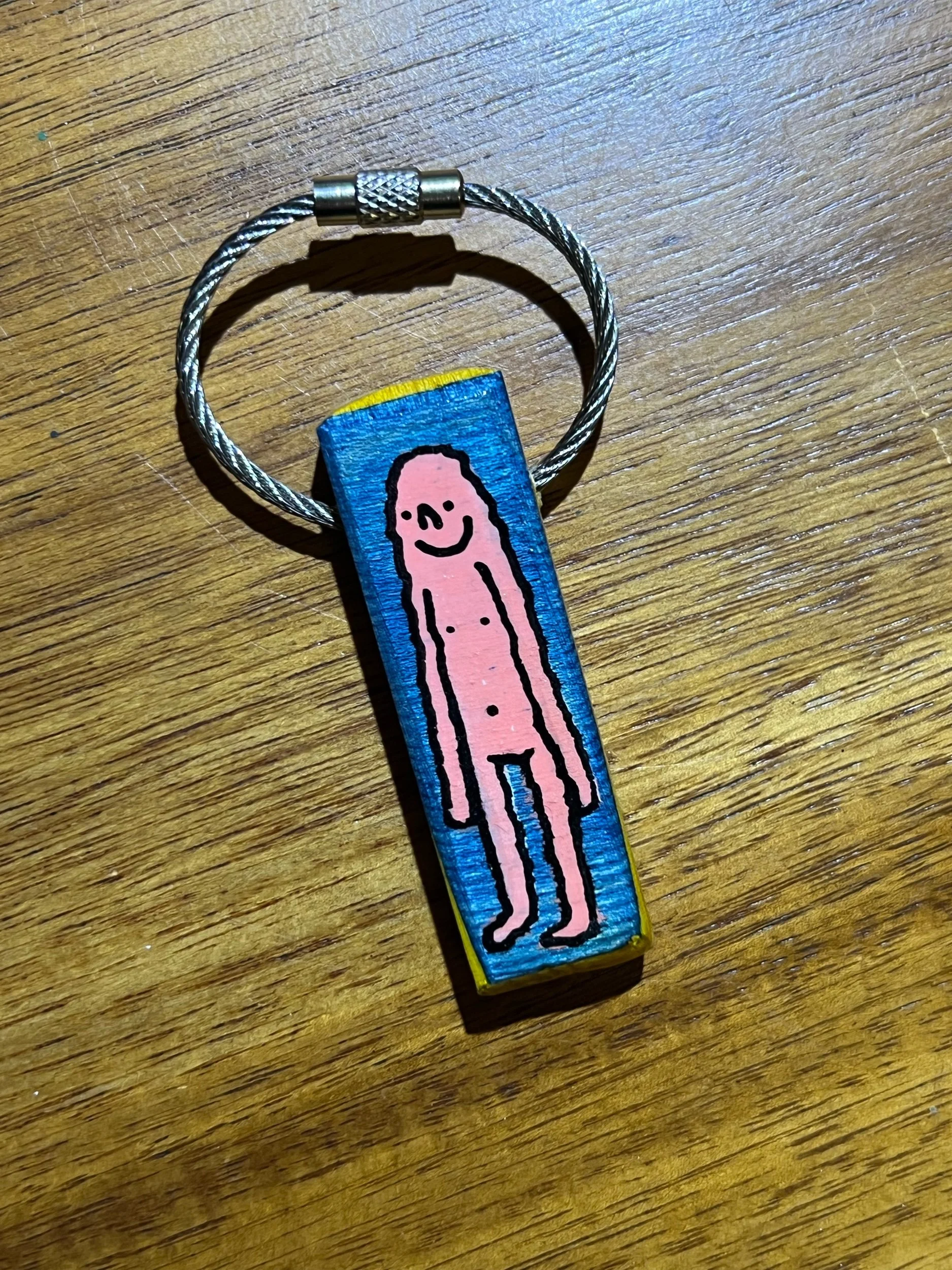 cut, sanded, painted, coated with poly urethane, and attached with a steel cable link.