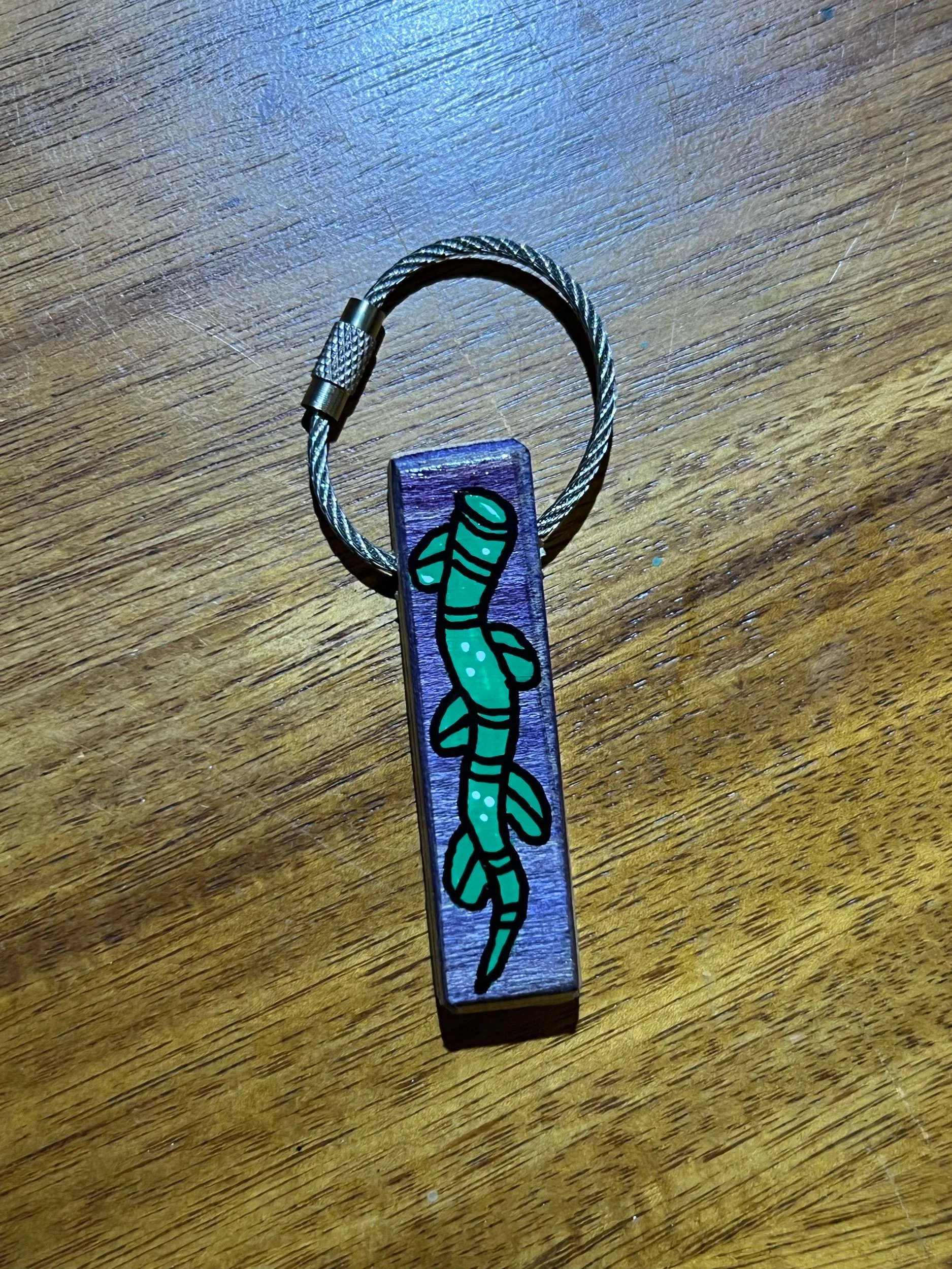 cut, sanded, painted, coated with poly urethane, and attached with a steel cable link.