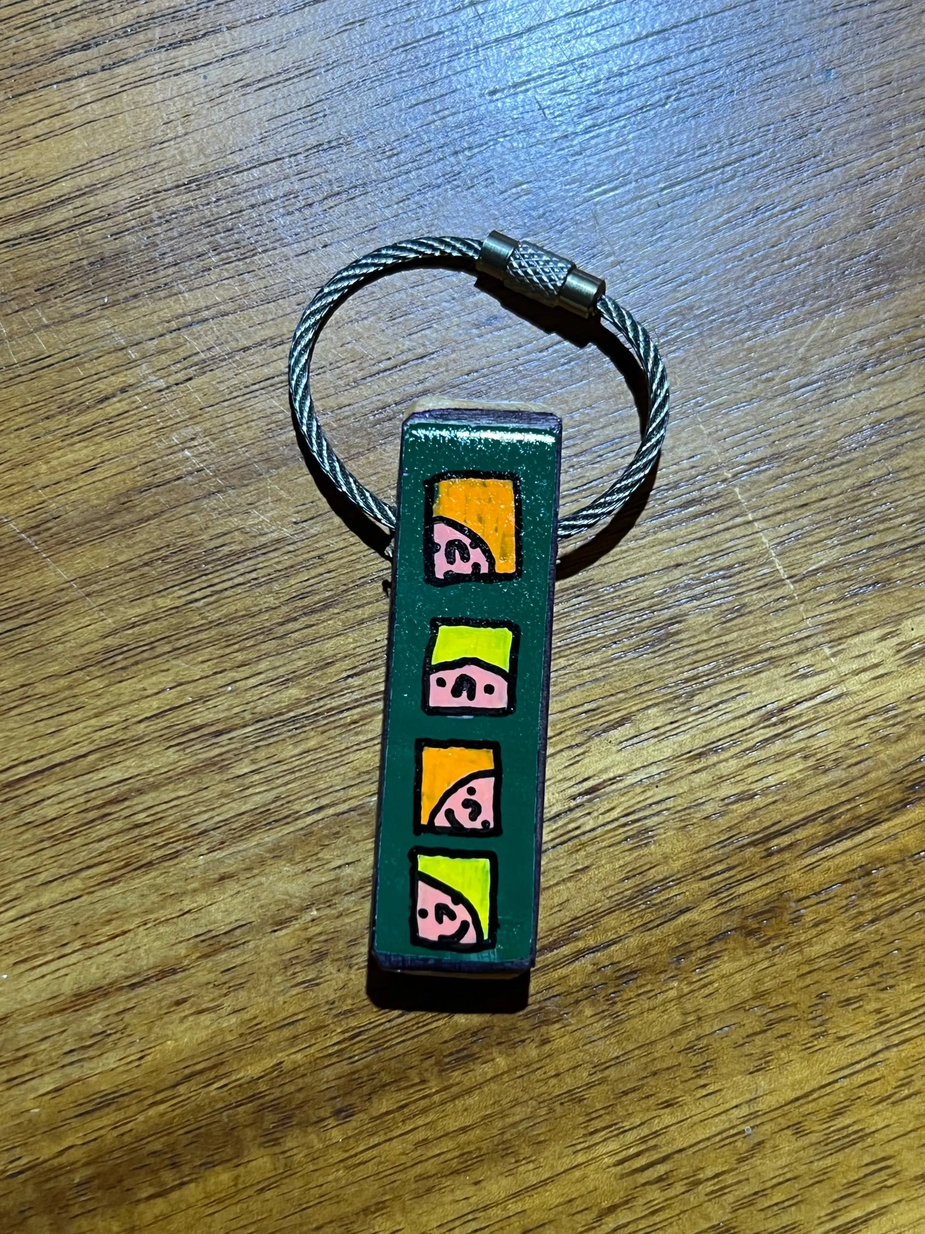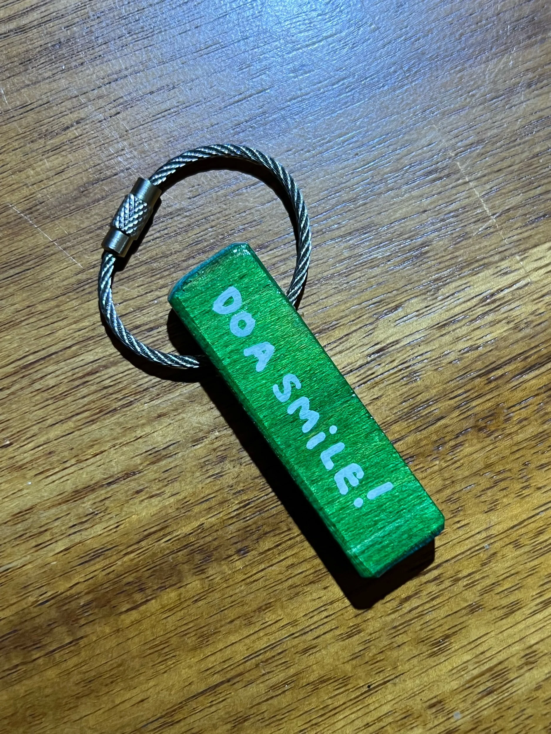 cut, sanded, painted, coated with poly urethane, and attached with a steel cable link.