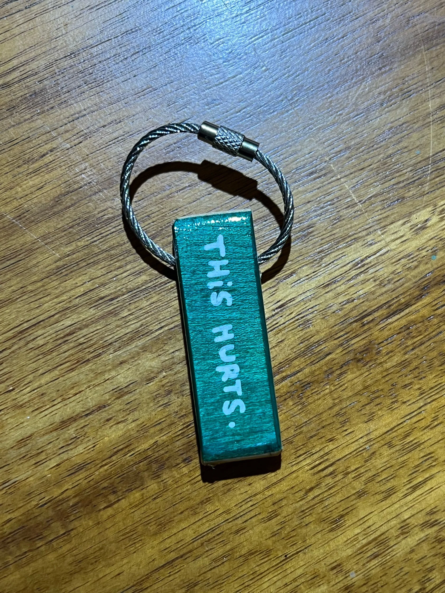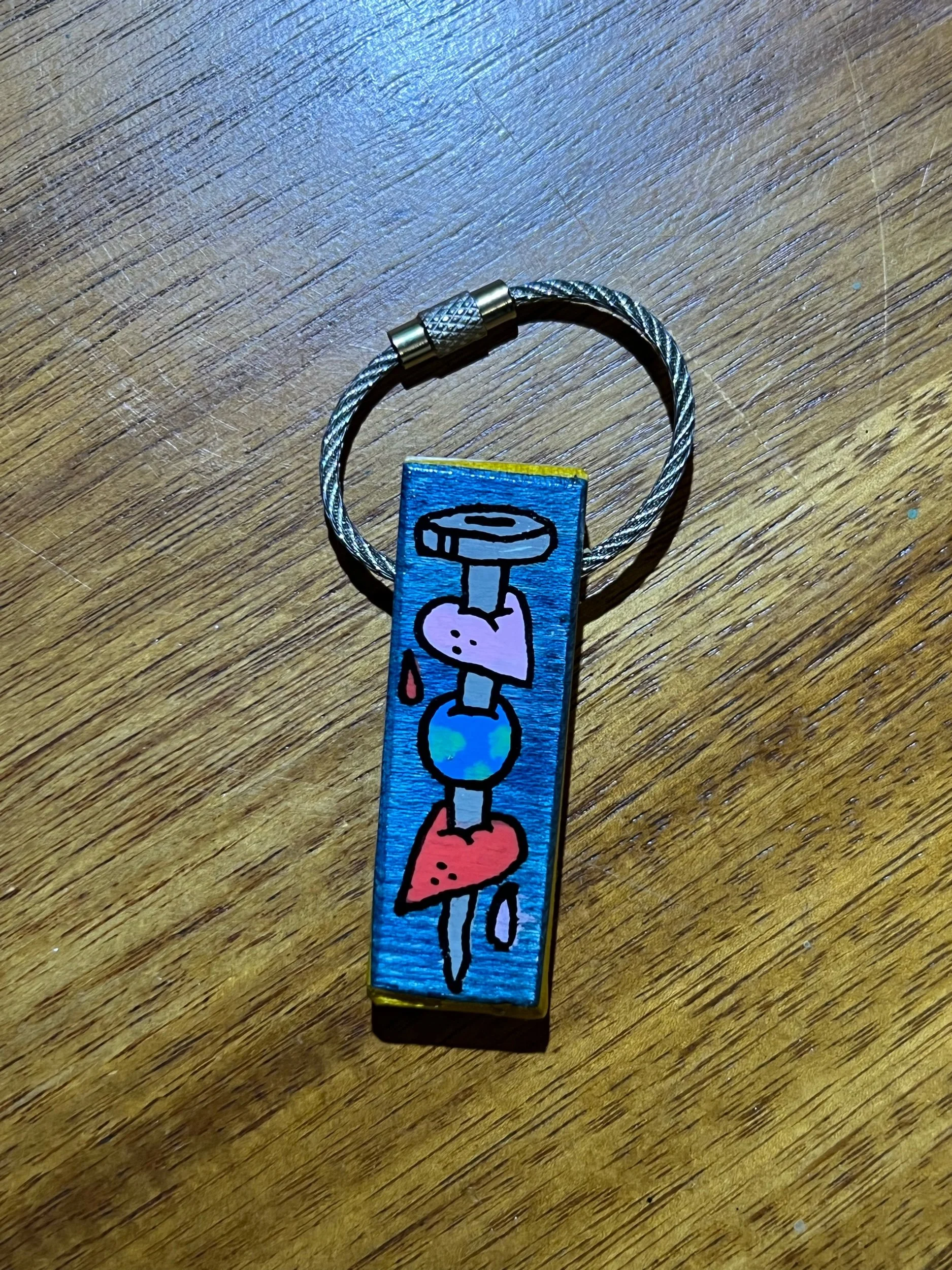 cut, sanded, painted, coated with poly urethane, and attached with a steel cable link.