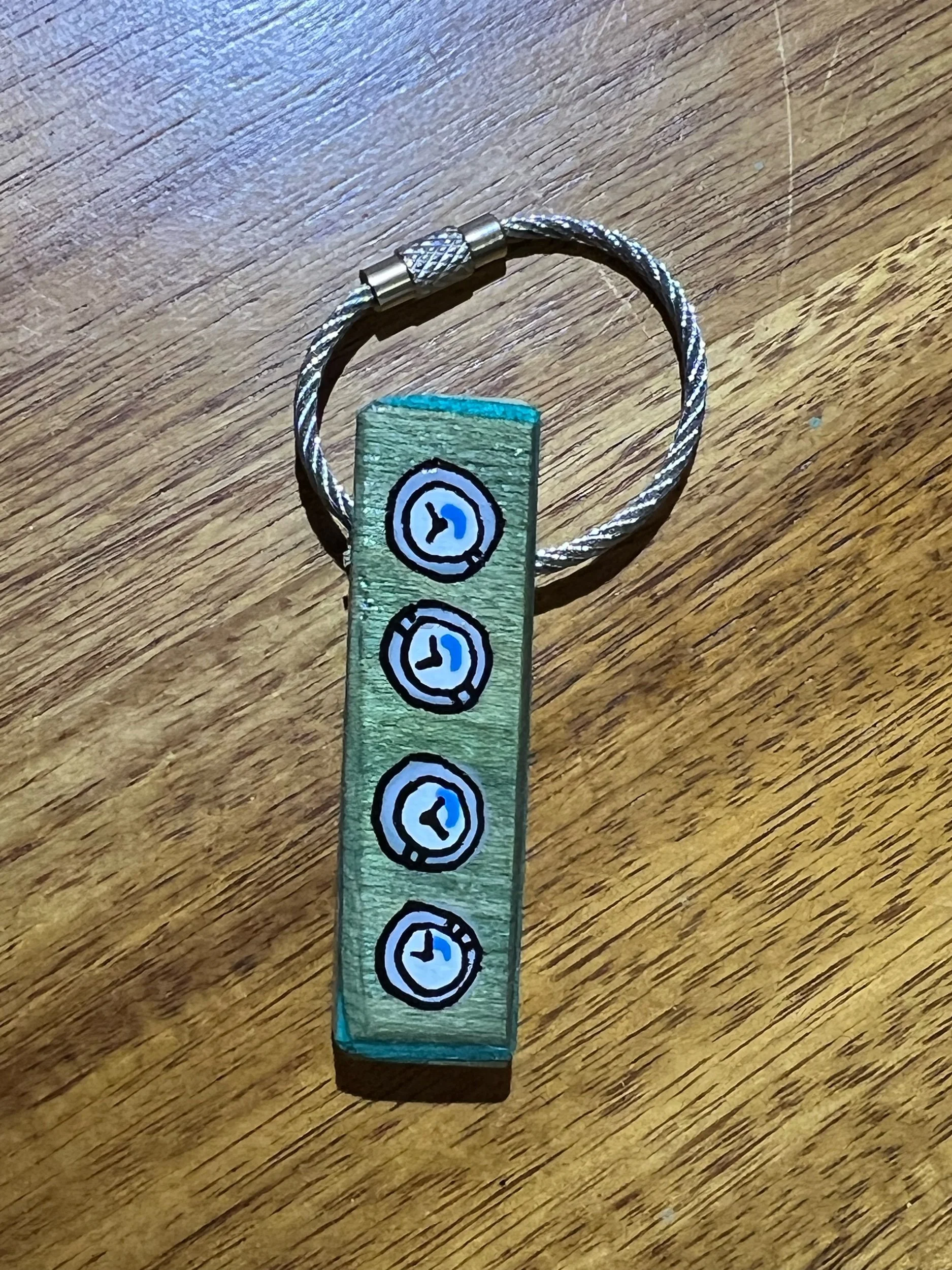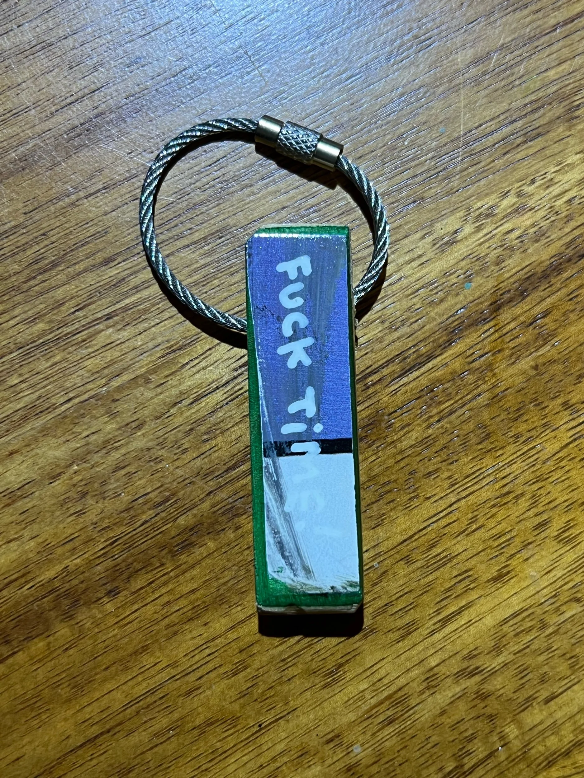 cut, sanded, painted, coated with poly urethane, and attached with a steel cable link.