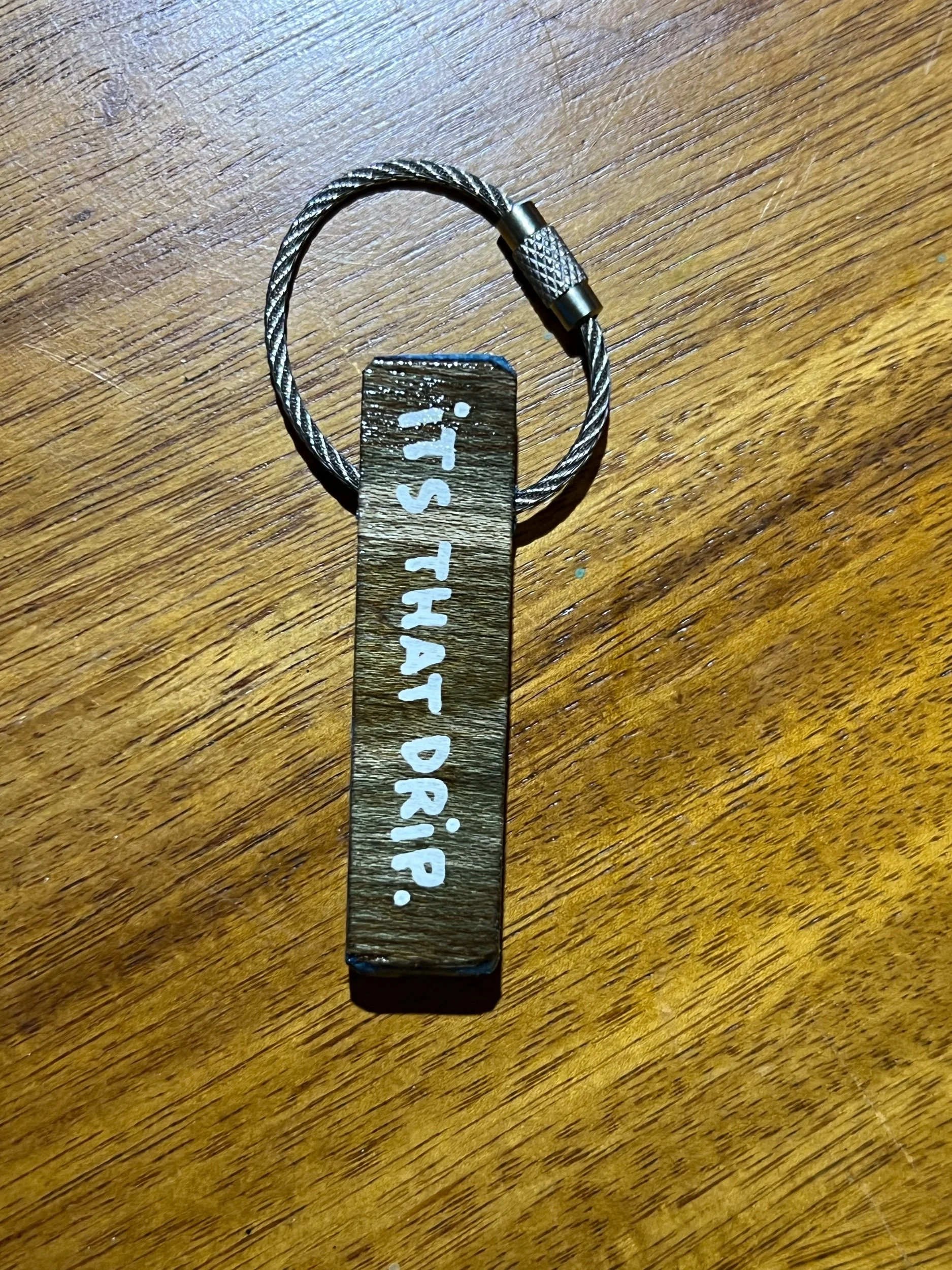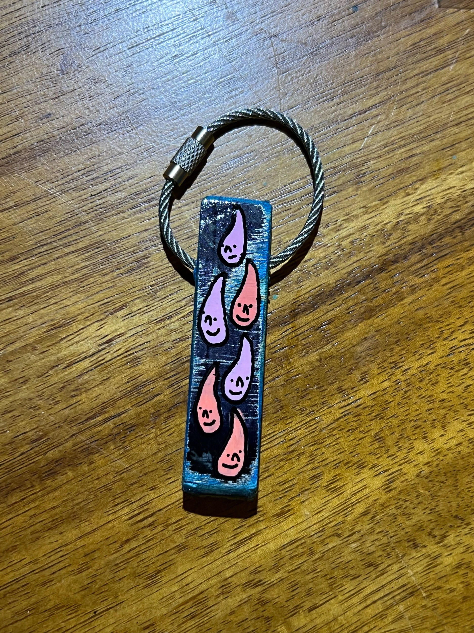 cut, sanded, painted, coated with poly urethane, and attached with a steel cable link.